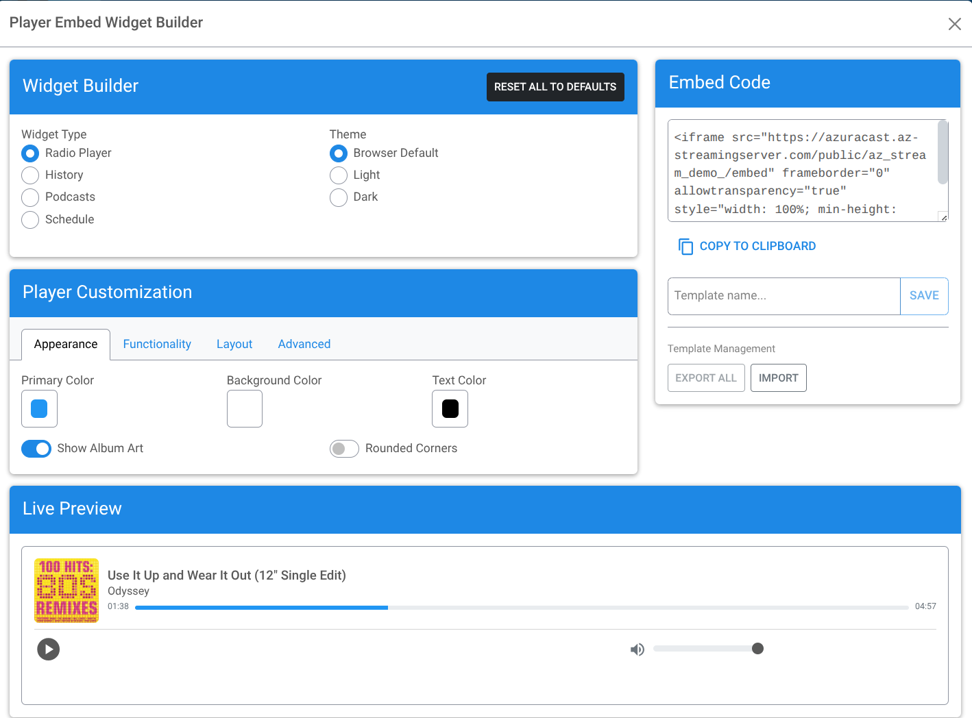 If you have your own WordPress or Wix website, you want listeners to stay on your domain. Both AzuraCast and CentovaCast provide ready-to-use embed codes.